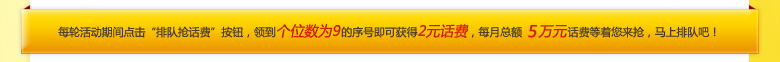 尊敬的客户,您好! “天天抢话费”活动。每轮活动期间点击“排队抢话费”按钮,领到个位数为9的序号即可获得2元话费,每月总额5万元话费等着您来抢,马上排队吧! |